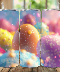 Embrace the beauty of spring with this stunning 20 oz tumbler, featuring large, vibrantly colored pastel eggs that glisten with dewdrops and sparkling glitter. Each egg shimmers with an ethereal glow, as if touched by the morning sun, bringing a sense of freshness and renewal to this enchanting design.