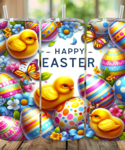 Delicate spring flowers bloom throughout the scene, adding a touch of elegance and whimsy. At the center, the words “Happy Easter” shine brightly, bringing warmth and seasonal charm to this delightful tumbler.