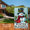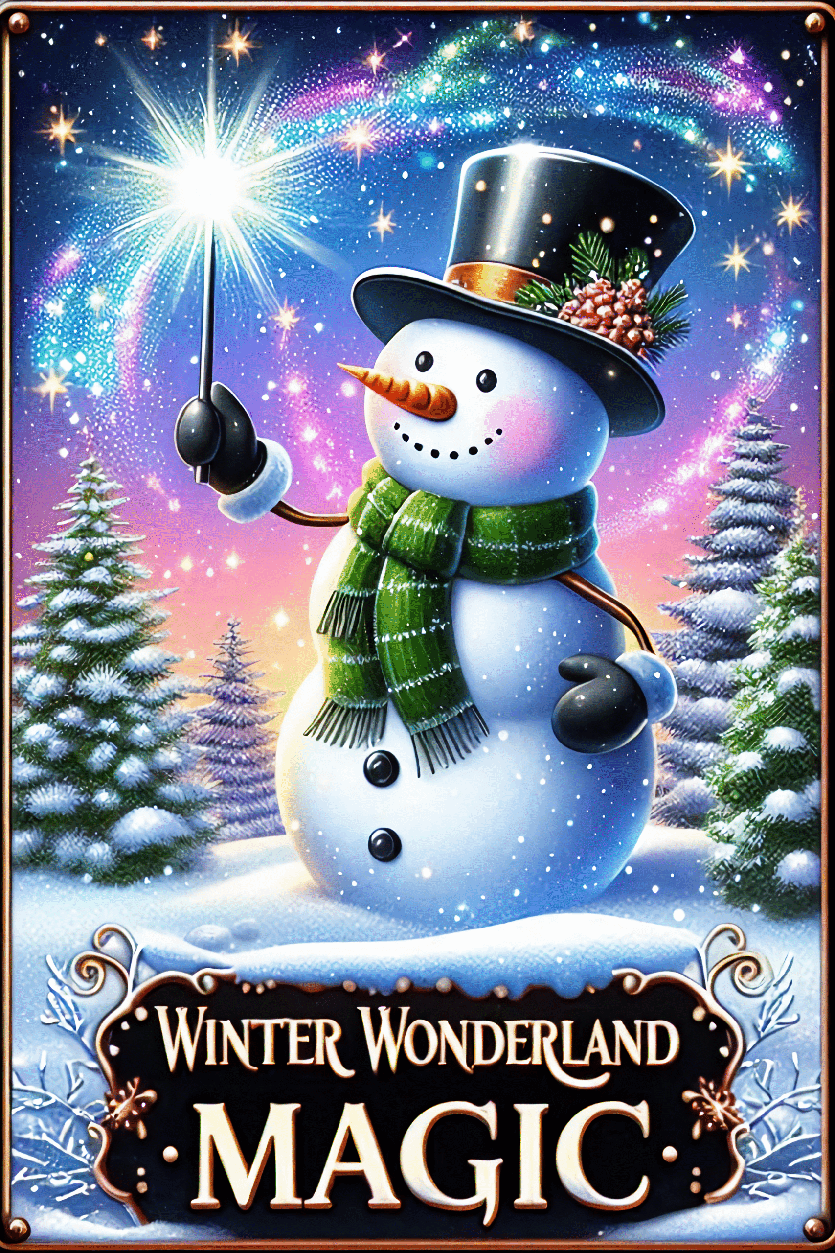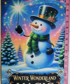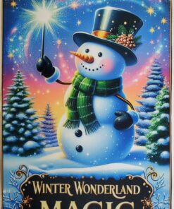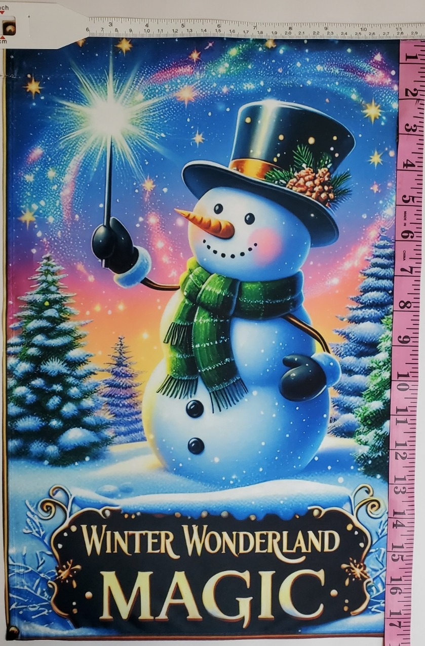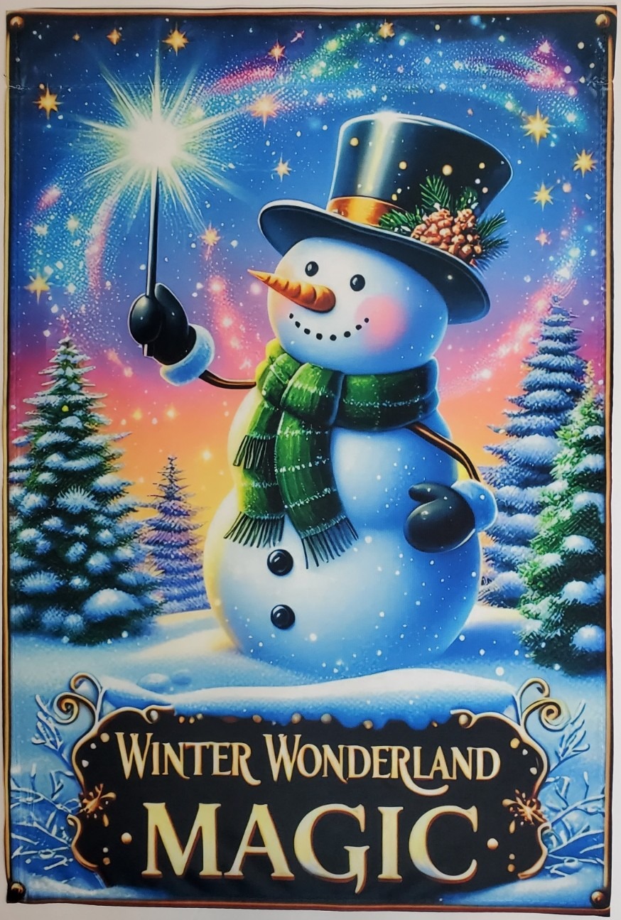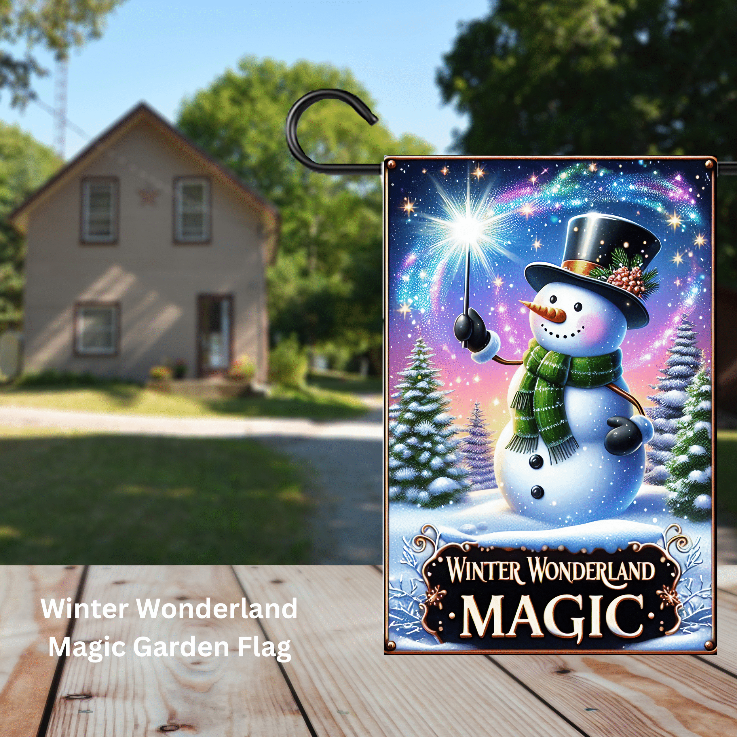 Bring a little sparkle to your yard this season with this enchanting Winter Wonderland Magic garden flag. A cheerful snowman dressed in a classic black top hat and green plaid scarf stands in a snowy forest, holding a glowing wand that lights up the sky with colorful, swirling winter enchantment. Snow-dusted evergreens and a dreamy evening sky complete the magical scene, creating the perfect festive welcome for guests and passersby.
